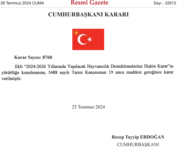 2024-2026 HAYVANCILIK DESTEKLEMELERİNE İLİŞKİN KARAR